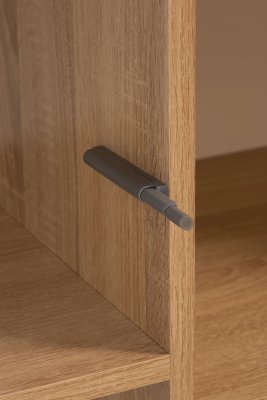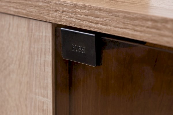 Створки крепятся на петли с доводчиками для плавности хода. Конструкцией предусмотрен механизм открывания створок «push-to-open». Ручки ящиков из натурального массива дуба.