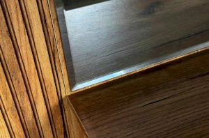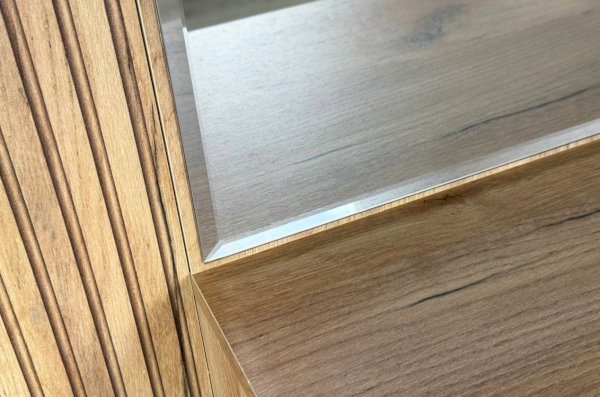 Принт, имитирующий вертикальную фрезеровку, придает зеркалу уникальный и современный вид, добавляя текстуру и глубину. Материал каркаса – ЛДСП, что обеспечивает прочность и долговечность, а также легкость в уходе.