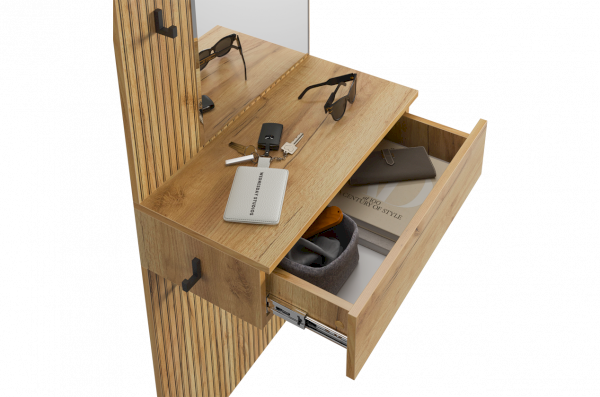 Крючки предоставляют удобное место для хранения сумок или аксессуаров. Выкатной ящик служит дополнительным пространством для хранения мелочей, таких как ключи, кошелек, косметика или другие небольшие предметы.