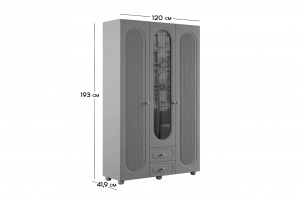 Шкаф оснащён тремя распашными дверями: две крайние двери выполнены из МДФ, а средняя дверь дополнена зеркалом, которое визуально расширяет пространство и делает комнату светлее. В нижней части предусмотрены два выкатных ящика, подходящих для хранения белья, аксессуаров или повседневных вещей.