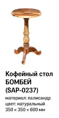 Компактный кофейный стол из коллекции BOMBAY – идеальное решение даже для небольшого помещения. Этот изящный предмет интерьера позволит привлечь внимание и сделать яркий акцент на определенной зоне в помещении. Элегантная форма, резная ножка ручной работы, разнообразие текстуры и уникальные оттенки древесины палисандра никого не оставят равнодушным. Удобные размеры стола позволяют использовать его как по прямому назначению, так и в качестве дополнительной сервировочной поверхности. Модель выполнена из массива палисандра, финишная обработка прозрачным лаком подчеркивает благородство рисунка, изысканность материала и красоту древесины. Массив палисандра обладает повышенной прочностью, долговечностью, не требует специального ухода и будет долгое время радовать вас своим первоначальным видом. Столик прекрасно сочетается с мебелью из коллекции BOMBAY, поставляется в собранном виде.
