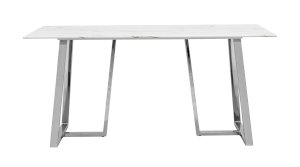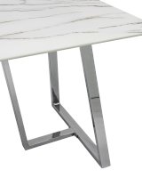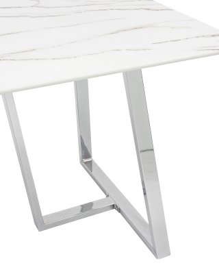 Обеденный стол с красивой стеклянной столешницей белого цвета с рисунком под мрамор. Красивая столешница гармонирует с металлическими ножками оригинальной формы. Такое сочетание смотрится эффектно в любом интерьере. Эта модель подойдет для большой семьи или в дом, где часто бывают гости. Габариты и форма стола позволяют свободно разместить 6-8 человек. Основание стола покрыто порошковой краской и крепится к плите МДФ с обратной стороны стеклянной столешницы. В основании ножек – подпятники для предотвращения царапин на полу. По высоте не регулируются.