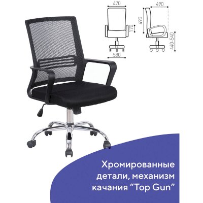 Кресло оснащено механизмом качания «топ-ган» с регулировкой под вес пользователя и возможностью фиксации спинки в рабочем положении.