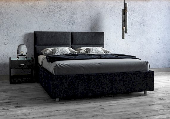 Лаконичная модель с изголовьем из объемных прямоугольников, сшитых между собой. Царги кровати выполняются по технологии съемного чехла. Модель изготовлена из ДСП. Обратная сторона изголовья обита спандбондом, но, при желании, её можно выполнить из основного обивочного материала. В комплект кровати входит кроватное основание. Каркас основания выполнен из металла, ламели - из берёзы. При необходимости в комплект кровати можно включить подъемный механизм с бельевым ящиком, который существенно увеличит объем хранения вещей, а так же позволит легко производить уборку пыли под кроватью.