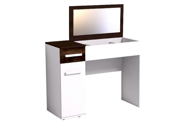 Простой с виду туалетный столик из коллекции Норвуд обладает интересной конструкцией. Откидная контрастная крышка стола скрывает нишу с органайзером для хранения мелких аксессуаров. На внутренней стороне крышки - зеркало, перед которым удобно наносить макияж и проводить косметические процедуры. Сбоку – отделение с полками за распашной дверцей и выдвижным ящиком, фасад которого выполнен из ЛДСП цвета Орех Шоколадный. Закрытый столик можно использовать для работы на ноутбуке или с документами. Модуль можно собирать как на левую, так и на правую сторону.